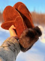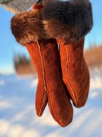 Fully lined with alaskan beaver, with a durable moose or deer leather exterior. Brown Colored