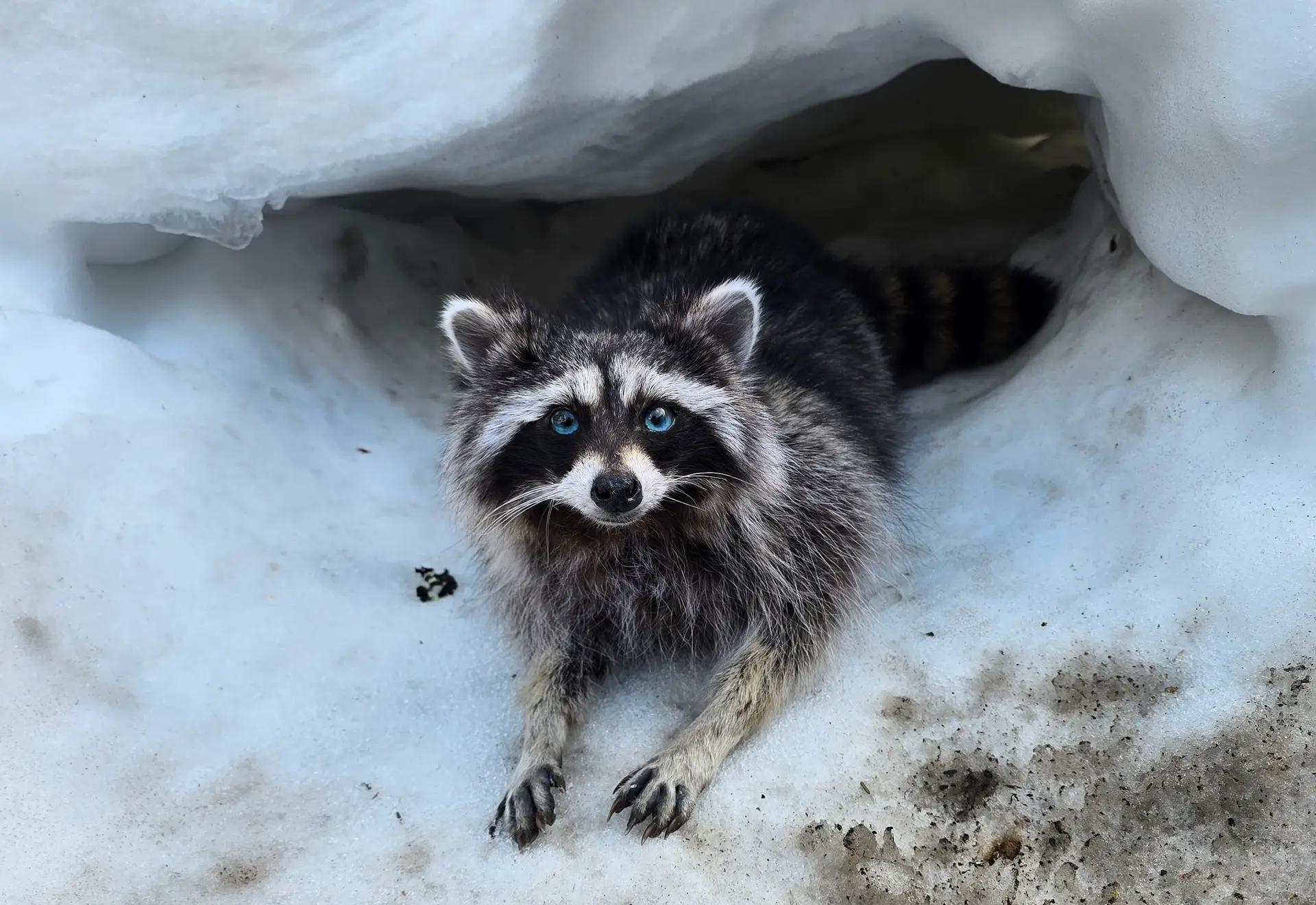 Fully posable softmount raccoon with bright blue eyes and a super thick winter coat. She has wire armature in her legs, neck, back and tail so that she can be positioned however you’d like.